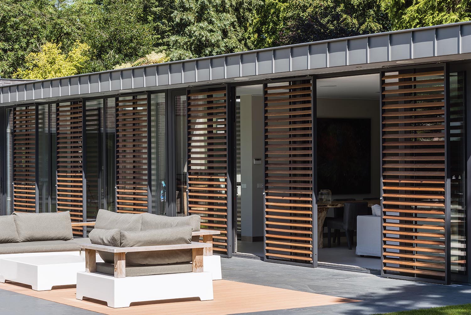 Les panneaux coulissants sont une forme de brise-soleil architectural ayant la flexibilité des stores. Vous décidez de faire glisser le panneau devant la fenêtre ou de le faire disparaître complètement. Vous avez ainsi tout le loisir de créer le climat intérieur idéal en été comme en hiver.